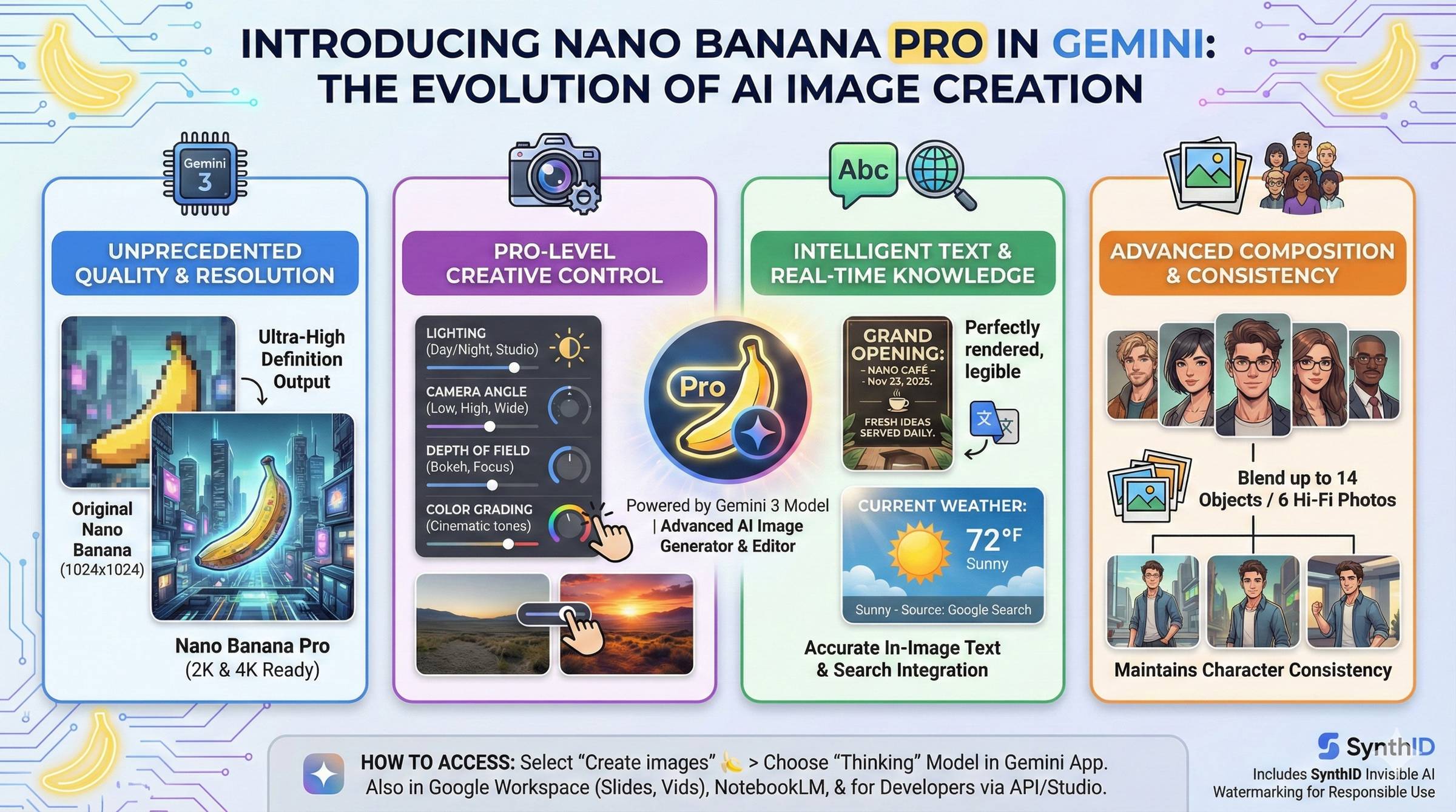 Nano Banana Pro is built for practical work: presentations, documentation, marketing, and education.