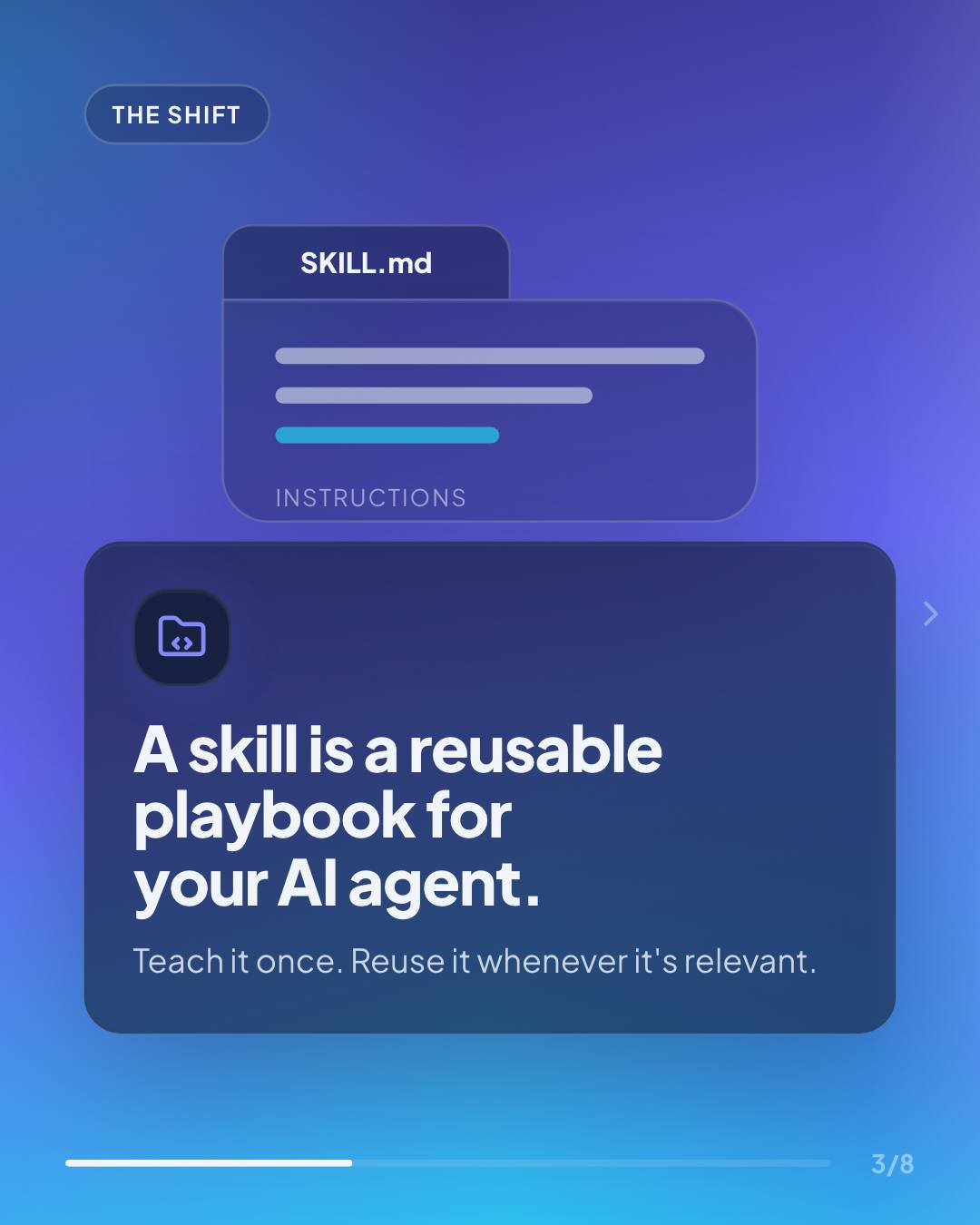 SKILL.md files are reusable playbooks for AI agents. They can include instructions, references, and sometimes scripts, and the agent only pulls them in when they’re relevant.